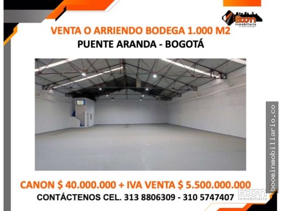VENTA O ARRIENDO BODEGA 1.000 M2 PUENTE ARANDA - BOGOTÁ